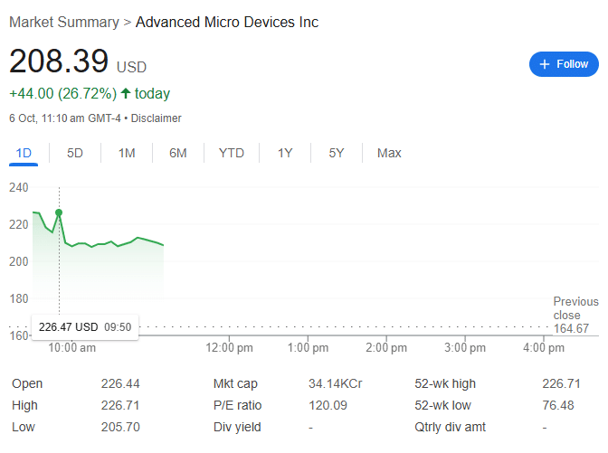 चिपमेकर कंपनी एडवांस्ड माइक्रो डिवाइसेज (AMD) के शेयर सोमवार को प्री-मार्केट ट्रेडिंग में 37% तक उछल गए. कंपनी के शेयरों में आए इस उछाल की वजह ओपन एआई के साथ हुई एक मल्टी-बिलियन डॉलर की डील है, जिसका ऐलान खुल सैम ऑल्टमैन ने किया है. इस डील के तहत OpenAI आने वाले कई सालों में AMD के 6 गीगावॉट (GW) GPU इस्तेमाल करेगी.