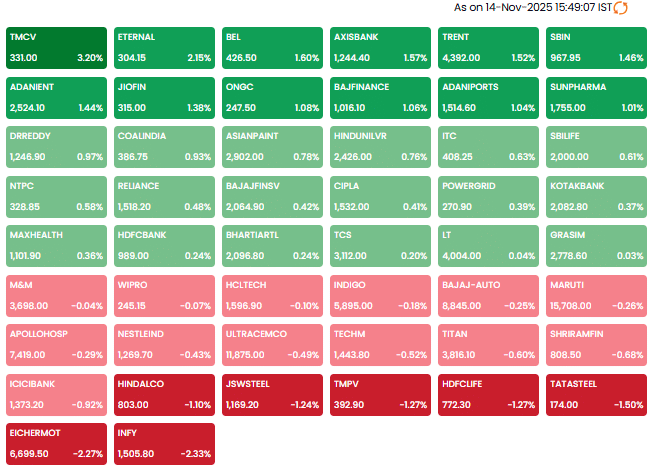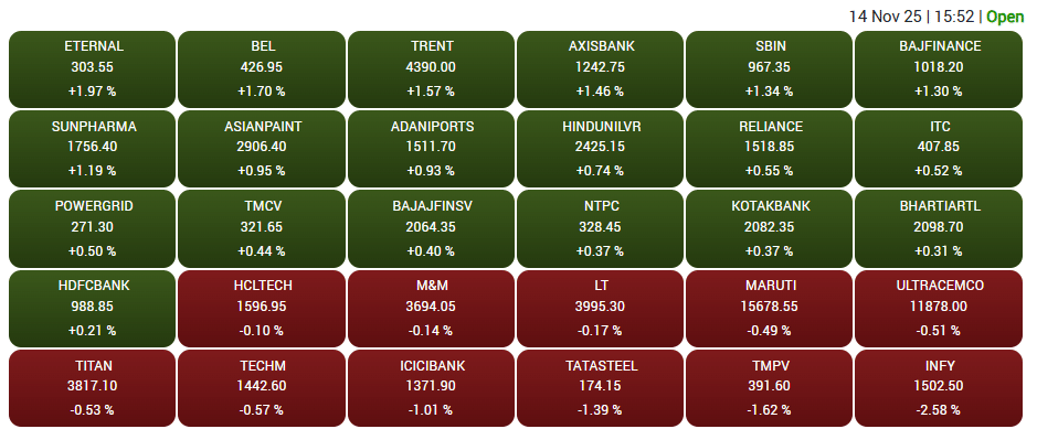 Closing Bell Analysis: तमाम पॉजिटिव क्यूज के बीच शुक्रवार को भारतीय बाजार के बेंचमार्क इंडेक्स निफ्टी और सेंसेक्स की ओपनिंग लाल निशान में हुई. हालांकि, दिन के आखिर में बाजार हरे निशान में बंद हुए हैं. खासतौर पर बिहार चुनाव के नतीजों को दिन के आखिर में आई तेजी का सबसे बड़ा ट्रिगर माना जा रहा है. इससे पहले गुरुवार को भी टॉप लेवल से बिकवाली देखने को मिली, जिसे एक्सपर्ट्स ने प्रॉफिट बुकिंग और बिहार चुनाव नतीजों से पहले निवेशकों की सावधानी बताया था. इसके बाद शुक्रवार को जब यह तय हो गया कि बिहार में भाजपा सबसे बड़ी पार्टी बनकर उभरी है और NDA प्रचंड बहुमत के साथ सरकार बनाने जा रही है, तो निवेशकों ने दिन के आखिर में फिर से बुलिश बेट्स शुरू कर दी हैं.