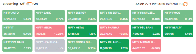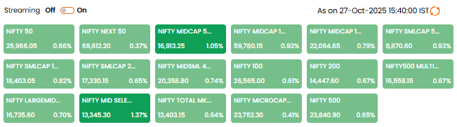ब्रॉड मार्केट में निफ्टी मिड कैप सलेक्ट और निफ्टी मिडकैप 50 टॉप गेनर इंडेक्स रहे. इसके अलावा पूरे ब्रॉड मार्केट में चौतरफा खरीदारी दिखी, जिसके चलते ज्यादातर बड़े ब्रॉड मार्केट इंडेक्स हरे निशान में ही बंद हुए.
