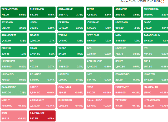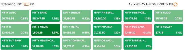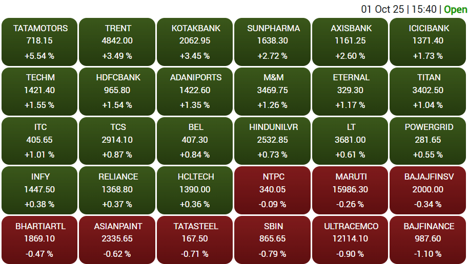 शेयर बाजार में अक्टूबर की शुरुआत धमाकेदार हुई है. चौतरफा खरीदारी के चलते बाजार 8 दिन की लगातार गिरावट से उबरते हुए नजर आया. बेंचमार्क इंडेक्स निफ्टी और सेंसेक्स दोनों ही करीब 1 फीसदी चढ़कर बंद हुए. वहीं, ब्रॉड मार्केट और सेक्टोरल मार्केट के ज्यादातर इंडेक्स तेजी में बंद हुए.