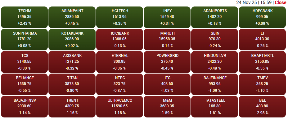 Nifty के भीतर कुछ चुनिंदा स्टॉक्स ने गिरावट के बावजूद मजबूत प्रदर्शन किया. इनमें Tech Mahindra और Eicher Motors दिन के टॉप गेनर्स रहे. वहीं, दूसरी तरफ BEL (Bharat Electronics) और JSW Steel ने इंडेक्स पर सबसे ज्यादा दबाव डाला.