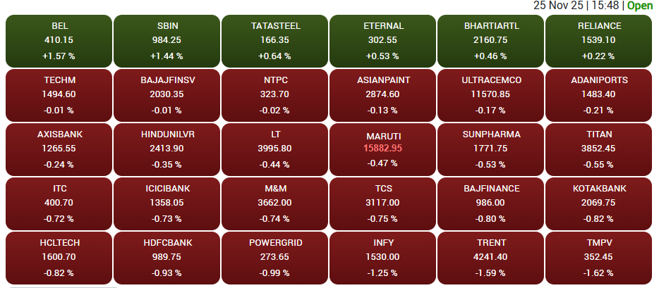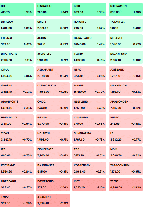 कमजोर सेंटिमेंट के बीच कुछ चुनिंदा स्टॉक्स ने मजबूती दिखाई. BEL 1.58% चढ़कर 410.20 पर बंद हुआ और पूरे सत्र में सबसे ज्यादा सक्रिय स्टॉक्स में शामिल रहा. Hindalco में 1.44% और SBI में 1.33% की तेजी दिखी. Shriram Finance और SBI Life भी गेनर्स में रहे.