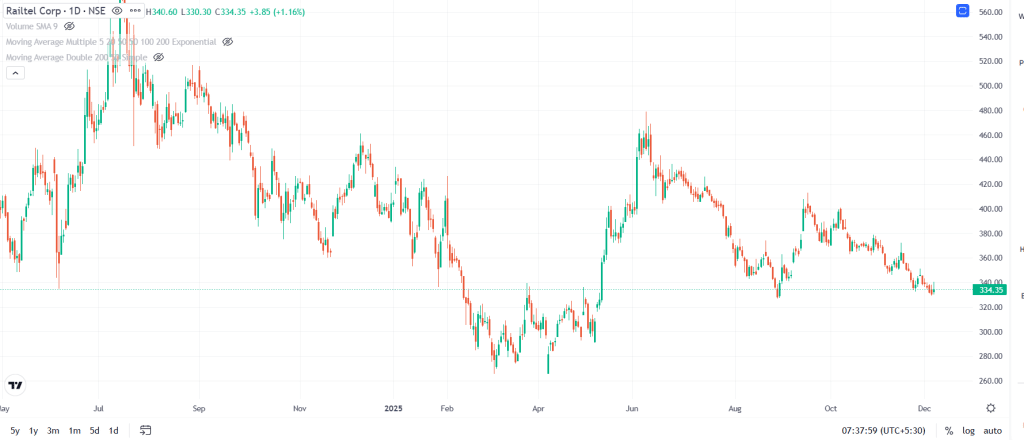 शेयर की बात करें तो RailTel आज 1.16 फीसदी बढ़कर 334.35 रुपये पर कारोबार कर रहा है. पिछले एक सप्ताह में शेयर 1.34 फीसदी गिरा है, तिमाही में 2.95 फीसदी नीचे और पिछले एक साल में 23.29 फीसदी टूट चुका है. शेयर अपने 52-वीक के हाई से 30.19 फीसदी नीचे ट्रेड कर रहा है. RailTel का मार्केट कैप 5 दिसंबर 2025 तक 10,730.58 करोड़ रुपये है.
