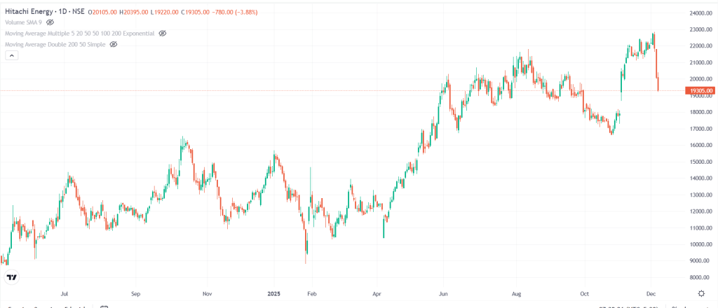 Hitachi Energy का शेयर 3.88 फीसदी गिरकर 19,305 रुपये पर ट्रेड कर रहा है. पिछले एक सप्ताह में यह 12.47 फीसदी टूटा है, तिमाही में 2.41 फीसदी ऊपर और पिछले एक साल में 59.88 फीसदी की जोरदार तेजी दिखा चुका है. 5 दिसंबर 2025 तक कंपनी का मार्केट कैप 86,047.02 करोड़ रुपये है.
