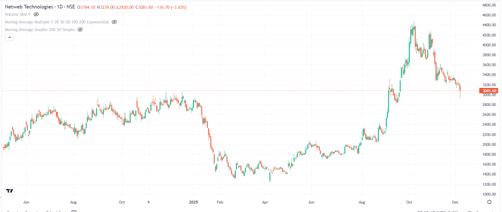 Netweb Technologies का शेयर आज 3.65 फीसदी गिरकर 3,081.6 रुपये पर है. पिछले एक सप्ताह में शेयर 6.37 फीसदी टूटा है, तिमाही में लगभग फ्लैट (0.07 फीसदी ऊपर) और एक साल में 6.34 फीसदी की तेजी दिखा चुका है. यह अपने 52-वीक के हाई से 31.20 फीसदी नीचे है. 5 दिसंबर 2025 तक कंपनी का मार्केट कैप 17,458.47 करोड़ रुपये रहा.