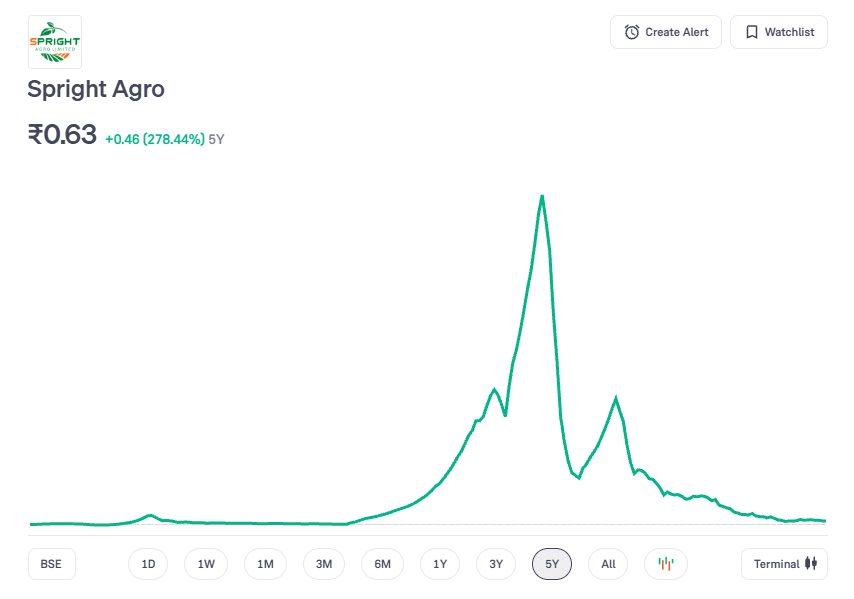 शुक्रवार को Spright Agro के शेयरों में 5 फीसदी का अपर सर्किट लगा. इसके बाद एक शेयर की कीमत ₹0.60 के स्तर पर पहुंच गई. कंपनी का मार्केट कैप लगभग ₹68 करोड़ है. सबसे खास बात यह है कि कंपनी पर कोई कर्ज नहीं है. पिछले 5 साल में शेयर ने 278 फीसदी से अधिक का रिटर्न दिया है.