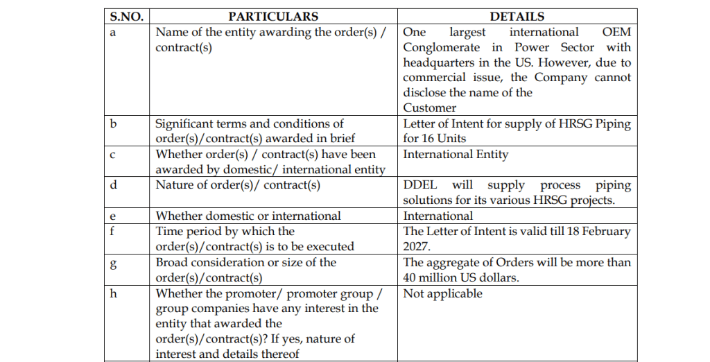 DEE Development को एक बड़ी सफलता मिली है. कंपनी ने अमेरिका की एक प्रमुख पावर सेक्टर OEM ग्रुप से 40 मिलियन डॉलर से ज्यादा का ऑर्डर हासिल किया है. यह कॉन्ट्रैक्ट हीट रिकवरी स्टीम जेनरेटर यानी HRSG प्रोजेक्ट्स के लिए प्रोसेस पाइपिंग सॉल्यूशंस की सप्लाई से जुड़ा है. यह डील लेटर ऑफ इंटेंट के जरिये किया गया है, जो 18 फरवरी 2027 तक वैध रहेगा. कंपनी 16 यूनिट्स के लिए HRSG पाइपिंग सप्लाई करेगी. कारोबारी कारणों से ग्राहक का नाम सार्वजनिक नहीं किया गया है, लेकिन यह डील कंपनी के लिए ग्लोबल लेवल पर बड़ा विस्तार मानी जा रही है. शुक्रवार के कारोबार में कंपनी के शेयर 10.14 प्रतिशत की तेजी के साथ ट्रेड कर रहे थे.