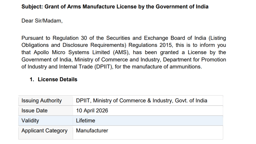 Apollo Micro Systems Share Price : डिफेंस सेक्टर की कंपनी Apollo Micro Systems के शेयरों में शुक्रवार को जोरदार तेजी देखने को मिली. कंपनी के शेयर इंट्राडे में करीब 16 फीसदी से ज्यादा उछलकर 282.90 रुपये के भाव पर चले गए. इस तेजी के पीछे सरकार से मिला बड़ा लाइसेंस ट्रिगर बना है. कंपनी ने एक्सचेंज फाइलिंग में जानकारी दी कि उसे भारत सरकार के वाणिज्य और उद्योग मंत्रालय के तहत DPIIT से गोला-बारूद बनाने का लाइसेंस मिल गया है. यह लाइसेंस 10 अप्रैल 2026 को जारी किया गया और यह लाइफटाइम के लिए वैध है. इस मंजूरी के बाद कंपनी अब हाई वैल्यू डिफेंस प्रोडक्ट्स का निर्माण, असेंबली, इंटीग्रेशन और टेस्टिंग कर सकेगी.