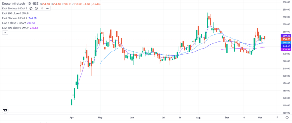 7 अक्टूबर 2025 को Desco Infratech का शेयर लाल निशान में कारोबार कर रहा है और यह 0.64 फीसदी गिरकर 250 रुपये पर ट्रेड कर रहा था. कंपनी का मार्केट कैप करीब 191.9 करोड़ रुपये है. वित्त वर्ष 2024-25 में कंपनी की कुल आय 59.61 करोड़ रुपये, नेट प्रॉफिट 9.06 करोड़ रुपये और EBITDA 13.51 करोड़ रुपये रहा. Desco Infratech का पीई रेशियो 21.19 और पीबी रेशियो 7.76 है. शेयर अपने 52 हफ्ते के निचले स्तर 160 रुपये से अब तक करीब 56 प्रतिशत की बढ़त दर्ज कर चुका है.
