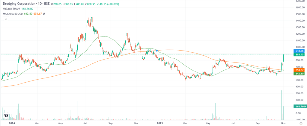 कंपनी Dredging Corporation of India Ltd (DCIL) के शेयरों में 3 नवंबर को जबरदस्त तेजी देखने को मिली. स्टॉक 20 फीसदी अपर सर्किट को छूते हुए 889.35 रुपये तक पहुंच गया. तेजी की यह वजह कंपनी द्वारा 17,645 करोड़ रुपये के 22 MoUs पर हस्ताक्षर करना रही, जो India Maritime Week 2025 के दौरान मुंबई में 27 से 31 अक्टूबर के बीच साइन किए गए. जुलाई 2024 में यही शेयर 1457 रुपये के भाव पर कामकाज कर रहा था. उसके बाद से इसमें बिकवाली देखने को मिली. अब जिस तरह से तेजी आ रही है, अब देखना होगा कि क्या यह शेयर अपने पुराने भाव पर जाता है या नहीं?