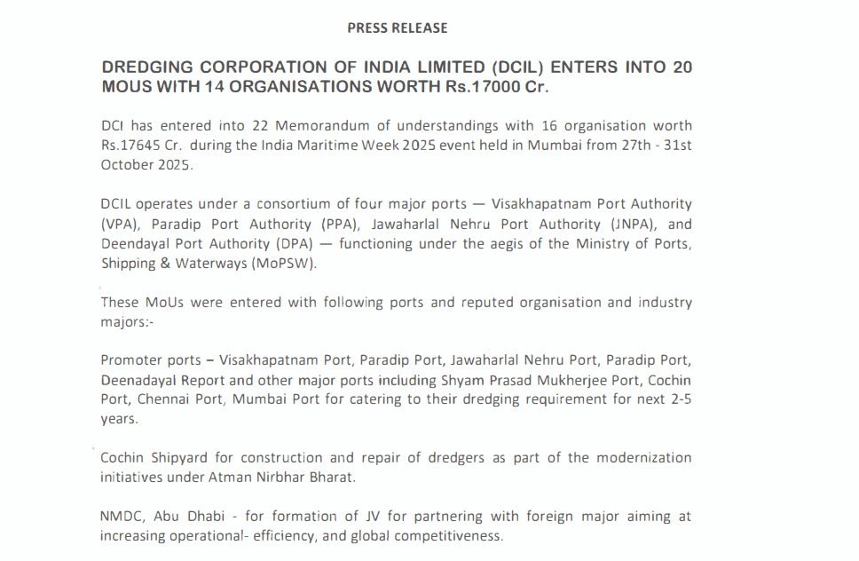 कंपनी ने 16 अलग-अलग संगठनों के साथ 22 MoU साइन किए हैं, जिनका मकसद देश में ड्रेजिंग इंफ्रास्ट्रक्चर को मजबूत बनाना है. प्रधानमंत्री नरेंद्र मोदी ने हाल ही में India Maritime Week 2025 के उद्घाटन समारोह के दौरान DCIL के आधुनिकीकरण के लिए 4,000 करोड़ रुपये के निवेश की घोषणा की थी. यह निवेश फ्लीट मॉडर्नाइजेशन और कैपेसिटी एन्हांसमेंट पर खर्च होगा, जिससे भारत की ड्रेजिंग क्षमता में बड़ा सुधार आने की उम्मीद है.