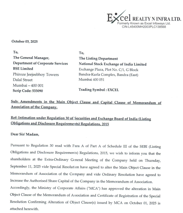 Excel Realty Authorized Capital Share Return: Excel Realty N Infra Limited, जिसे पहले Excel Infoways Limited के नाम से जाना जाता था, ने अपने Memorandum of Association (MOA) में बड़े बदलाव किए हैं. कंपनी को इसके लिए कॉर्पोरेट अफेयर्स मंत्रालय (MCA) से आधिकारिक मंजूरी मिल चुकी है. ये संशोधन कंपनी के शेयरधारकों की ओर से 11 सितंबर को आयोजित EGM में पारित किए गए थे और बाद में 1 अक्टूबर 2025 को MCA द्वारा पंजीकृत किए गए.