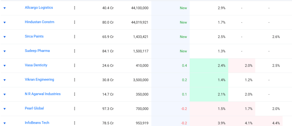 जाने माने निवेशक मुकुल महावीर अग्रवाल ने दिसंबर तिमाही में अपने पोर्टफोलियो में चार नई कंपनियों को शामिल किया. उन्होंने हिंदुस्तान कंस्ट्रक्शन में 1.7%, अलकार्गो लॉजिस्टिक्स में 2.9%, सुदीप फार्मा में 1.3% हिस्सेदारी खरीदी और सिरका पेंट्स में 2.5% हासिल की है.