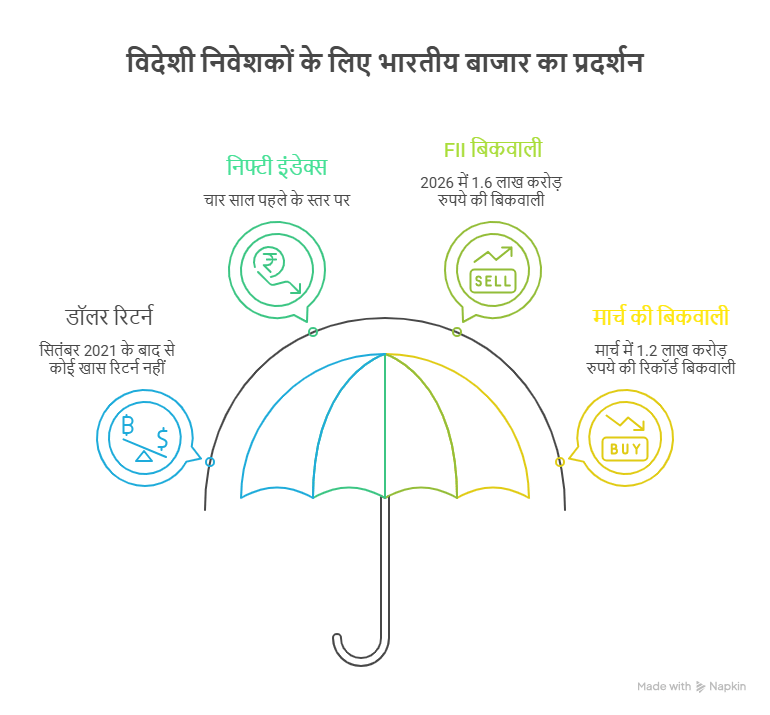 विदेशी निवेशकों को सितंबर 2021 के बाद से भारतीय बाजार में डॉलर के हिसाब से कोई खास रिटर्न नहीं मिला है. निफ्टी इंडेक्स लगभग वहीं पर आ गया है जहां वह चार साल पहले था. साल 2026 में FIIs अब तक करीब 1.6 लाख करोड़ रुपये के शेयर बेच चुके हैं. सिर्फ मार्च महीने में ही 1.2 लाख करोड़ रुपये की भारी बिकवाली हुई, जो अब तक की सबसे बड़ी है.