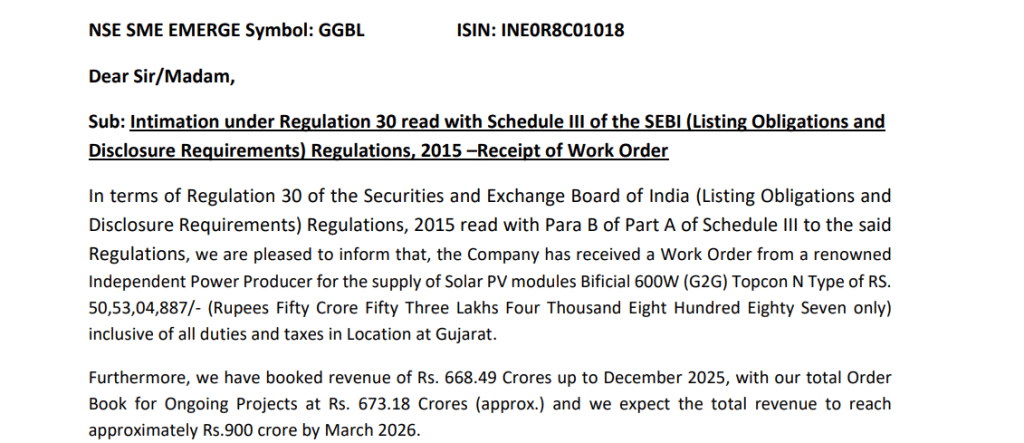 Ganesh Green Bharat के शेयर फिर से निवेशकों के रडार पर हैं. कंपनी ने रिन्यूएबल एनर्जी सेक्टर में अपनी पकड़ और मजबूत कर ली है. कंपनी को एक नामी Independent Power Producer से 50,53,04,887 रुपये का नया वर्क ऑर्डर मिला है. यह ऑर्डर गुजरात में हाई एफिशिएंसी बाइफेशियल 600W TOPCon N-Type सोलर पीवी मॉड्यूल्स की सप्लाई के लिए है. इस नए ऑर्डर के बाद Ganesh Green Bharat की ऑर्डर बुक और ज्यादा मजबूत हो गई है. दिसंबर 2025 तक कंपनी ने 668.49 करोड़ रुपये का रेवेन्यू दर्ज किया है. इसका असर 4 फरवरी को इसके शेयरों में देखने को मिला.