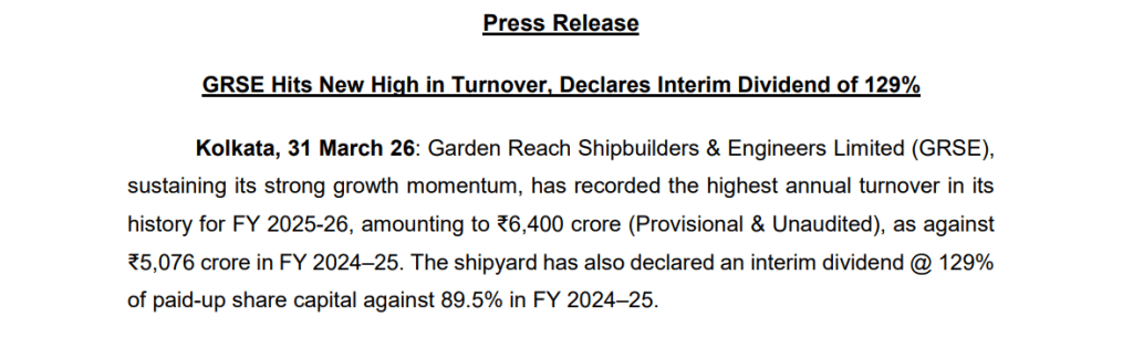 डिफेंस सेक्टर की कंपनी Garden Reach Shipbuilders & Engineers Limited एक बार फिर सुर्खियों में है. कंपनी ने वित्त वर्ष 2026 के लिए अपना अब तक का सबसे ज्यादा टर्नओवर दर्ज किया है. साथ ही निवेशकों के लिए बड़ा डिविडेंड भी घोषित किया है. हालांकि मजबूत फंडामेंटल के बावजूद शेयर में उतार-चढ़ाव देखने को मिला. सोमवार को यह 4.62 प्रतिशत गिरकर 1,972.80 रुपये पर बंद हुआ. यह अपने 52 हफ्ते के हाई से करीब 44.25 प्रतिशत नीचे ट्रेड कर रहा है.