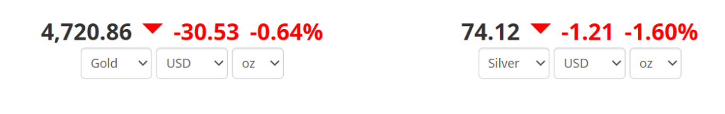 स्पॉट मार्केट में भी कमजोरी साफ दिख रही है. स्पॉट गोल्ड करीब $4,720.86 प्रति औंस पर ट्रेड कर रहा है, जिसमें करीब $30.53 (0.64%) की गिरावट दर्ज हुई है. वहीं स्पॉट सिल्वर भी दबाव में है और यह करीब $74.12 प्रति औंस पर ट्रेड कर रहा है, जिसमें $1.21 (1.60%) की गिरावट आई है.