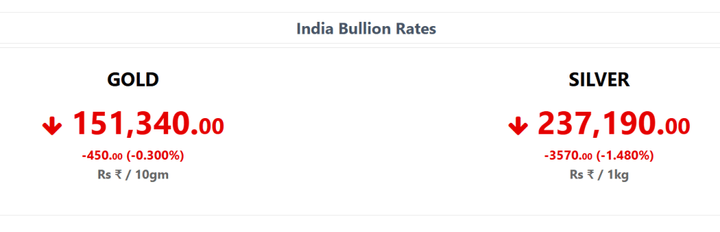 रिटेल बाजार में भी दोनों मेटल में लुढ़कन देखने को मिला. 24 कैरेट सोना 450 रुपये टूट कर 1,52,340 रुपये आ गया वहीं सिल्वर 3,570 रुपये फिसल कर 2,37,190 रुपये पर ट्रेड करने लगा. सोना अभी भी सुरक्षित निवेश के तौर पर टिके रहने की कोशिश कर रहा है, जबकि चांदी में कमजोरी दिख रही है.