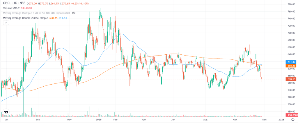 GHCL एक डाइवर्सिफाइड भारतीय कंपनी है जो इनऑर्गेनिक केमिकल्स और टेक्सटाइल कारोबार में सक्रिय है. कंपनी भारत में सोडा ऐश के सबसे बड़े निर्माताओं में से एक है और उद्योगों, डिटर्जेंट्स और ग्लास सेक्टर को सप्लाई करती है. ऑपरेशनल एफिशियंसी और प्रोडक्ट डाइवर्सिफिकेशन पर फोकस इसकी लंबी अवधि की ग्रोथ को सपोर्ट करता है. गोल्डन क्रॉस 21 नवम्बर 2025 को रुपये 610.72 के भाव पर बना. इस दौरान वॉल्यूम काफी कम रहा, सिर्फ 157.75 K.