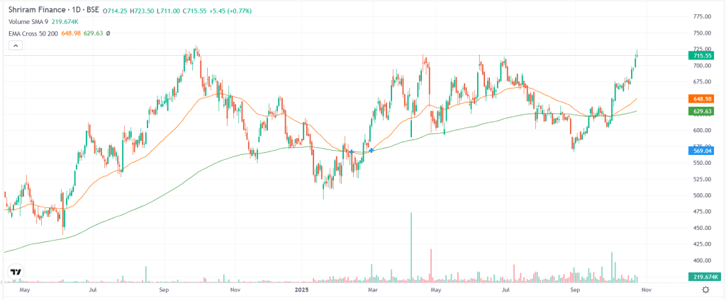 इस शेयर में गोल्डन क्रॉसओवर 21 अक्टूबर 2025 को 627.66 रुपये के स्तर पर देखने को मिला, जब शेयर ने अच्छे वॉल्यूम (6.75 लाख शेयर) के साथ मूविंग एवरेज को पार किया. शुक्रवार के सत्र में यह स्टॉक 716.50 रुपये पर बंद हुआ, जो इंट्रा-डे में 0.97 फीसदी की तेजी दिखाता है.