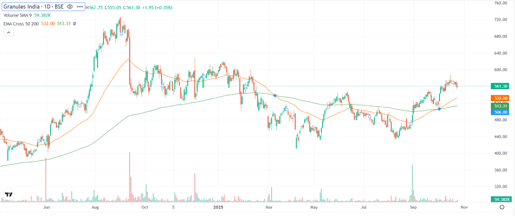 इस शेयर में गोल्डन क्रॉसओवर 17 अक्टूबर 2025 को 512.60 रुपये के स्तर पर देखने को मिला, जब शेयर ने 7.27 लाख शेयरों के मजबूत वॉल्यूम के साथ तेजी दिखाई. शुक्रवार को यह स्टॉक 561.95 रुपये पर बंद हुआ, जो 0.86 फीसदी की बढ़त दर्शाता है.