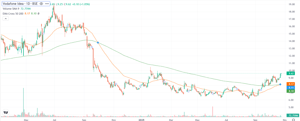 इस शेयर में गोल्डन क्रॉसओवर 17 अक्टूबर 2025 को 7.62 रुपये के स्तर पर देखने को मिला. शुक्रवार के सत्र में यह स्टॉक 9.63 रुपये पर बंद हुआ, जो 1.16 फीसदी की बढ़त दिखाता है.
