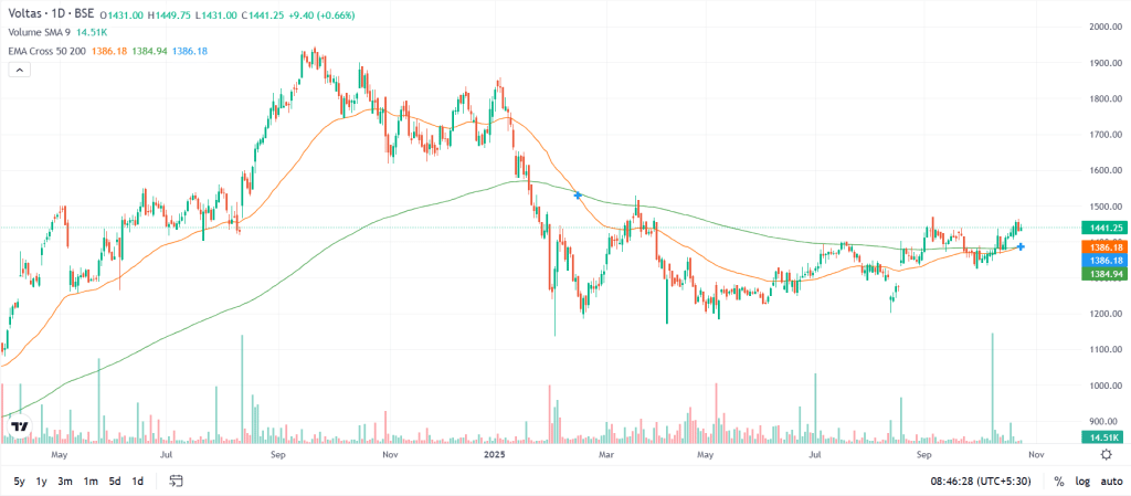 इस शेयर में गोल्डन क्रॉसओवर 16 अक्टूबर 2025 को 1,370.98 रुपये के स्तर पर देखने को मिला. करीब 9.10 लाख शेयरों के अच्छे वॉल्यूम के साथ यह ट्रेंड बना. शुक्रवार को यह स्टॉक 1,438.70 रुपये पर बंद हुआ, जो 0.52 फीसदी की तेजी दर्शाता है.