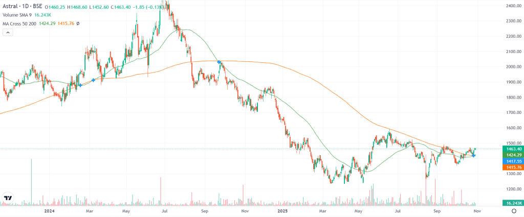 Astral Limited की शुरुआत 1996 में अहमदाबाद से हुई थी. कंपनी प्लंबिंग, ड्रेनेज, एडेहसिव, बाथवेयर और पेंट सेगमेंट में काम करती है और देश की प्रमुख बिल्डिंग मटेरियल कंपनियों में से एक है. 28 अक्टूबर 2025 को Astral के स्टॉक में गोल्डन क्रॉसओवर हुआ, जब इसका 50-DAY मूविंग एवरेज 200-DAY एवरेज से ऊपर गया. यह क्रॉसओवर 1,417.71 रुपये के लेवल पर दर्ज हुआ और स्टॉक ने गुरुवार को 1,464.90 रुपये पर हल्की तेजी के साथ क्लोजिंग दी.