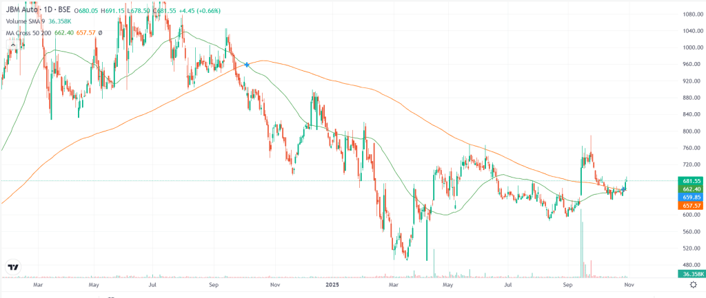 JBM Auto Limited की स्थापना 1996 में हुई थी. यह कंपनी ऑटो कॉम्पोनेंट्स व इलेक्ट्रिक बसों के निर्माण में अग्रणी है. गुरुग्राम स्थित यह कंपनी EV सेक्टर में भी तेजी से विस्तार कर रही है. JBM Auto के शेयर में 28 अक्टूबर 2025 को 681.55 रुपये के लेवल पर गोल्डन क्रॉसओवर देखा गया. इसके बाद स्टॉक में 0.49 प्रतिशत की बढ़त के साथ हल्की तेजी देखने को मिली और गुरुवार के सत्र में यह 680.95 रुपये पर बंद हुआ.
