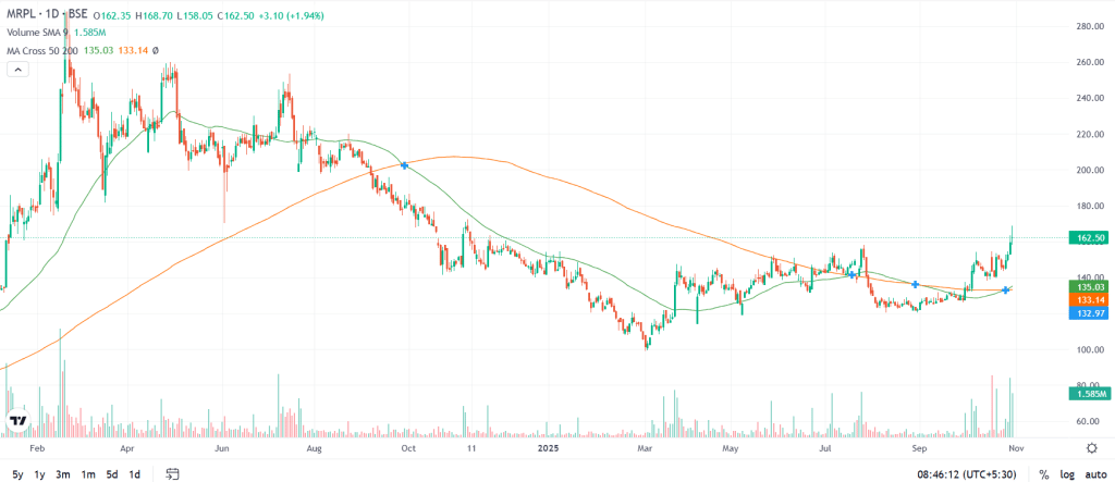 Mangalore Refinery and Petrochemicals Limited (MRPL), जो ONGC की सब्सिडियरी कंपनी है. इसने भी यह बुलिश पैटर्न दिखाया. 27 अक्टूबर 2025 को MRPL के शेयर में 132.96 रुपये के लेवल पर गोल्डन क्रॉसओवर हुआ. क्रॉसओवर के बाद स्टॉक में मजबूत वॉल्यूम (1.32 करोड़ शेयर) के साथ तेजी आई और यह 162.50 रुपये पर बंद हुआ, जिसमें 1.98 प्रतिशत की बढ़त दर्ज की गई.