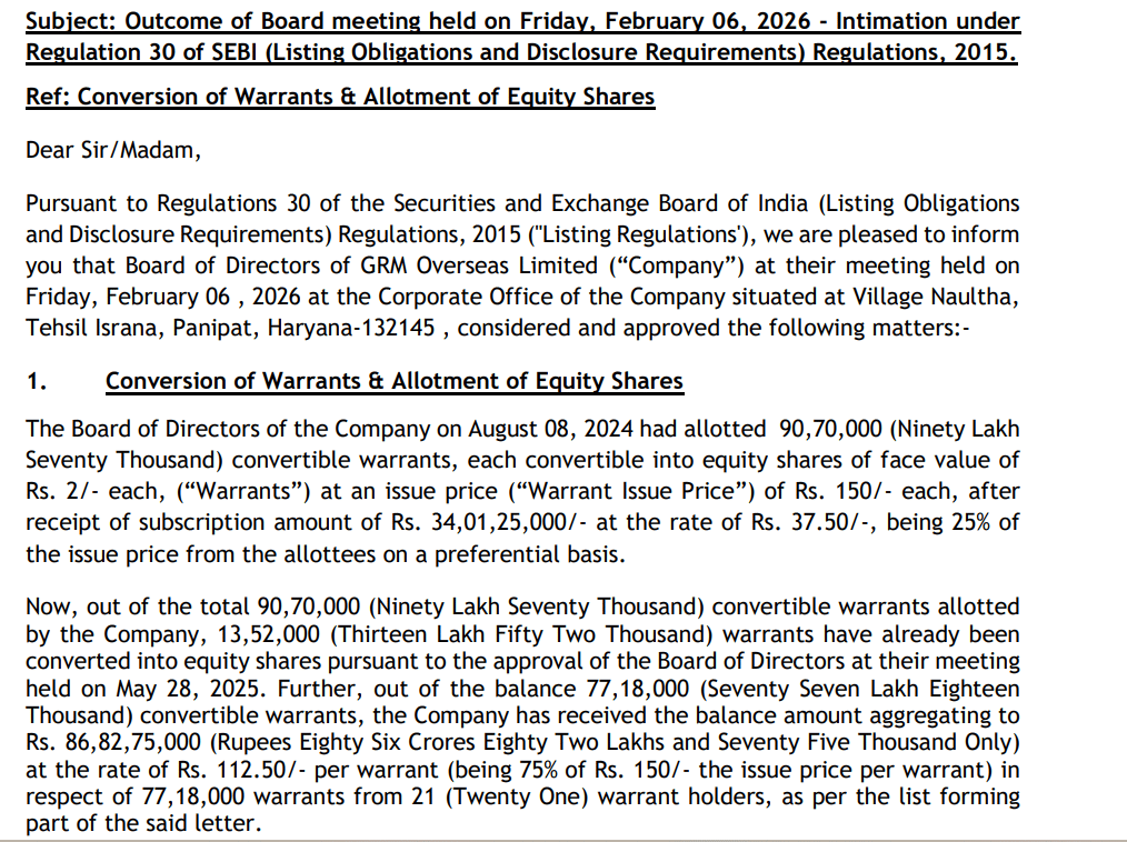 GRM Overseas: मल्टीबैगर रिटर्न देने वाली कंपनी GRM Overseas एक बार फिर निवेशकों के रडार पर आ गई है. पिछले 5 वर्षों में करीब 1245 फीसदी का शानदार रिटर्न देने वाला यह शेयर सोमवार 9 फरवरी 2026 को खास हलचल दिखा सकता है. इसकी वजह कंपनी द्वारा वॉरंट कनवर्जन और बोनस शेयर जारी करने से जुड़ा बड़ा अपडेट है, जिसे 6 फरवरी को बाजार बंद होने के बाद साझा किया गया. हाल के वर्षों में कंपनी के मजबूत वित्तीय प्रदर्शन और इक्विटी स्ट्रक्चर में हुए बदलावों ने निवेशकों का भरोसा और बढ़ाया है.