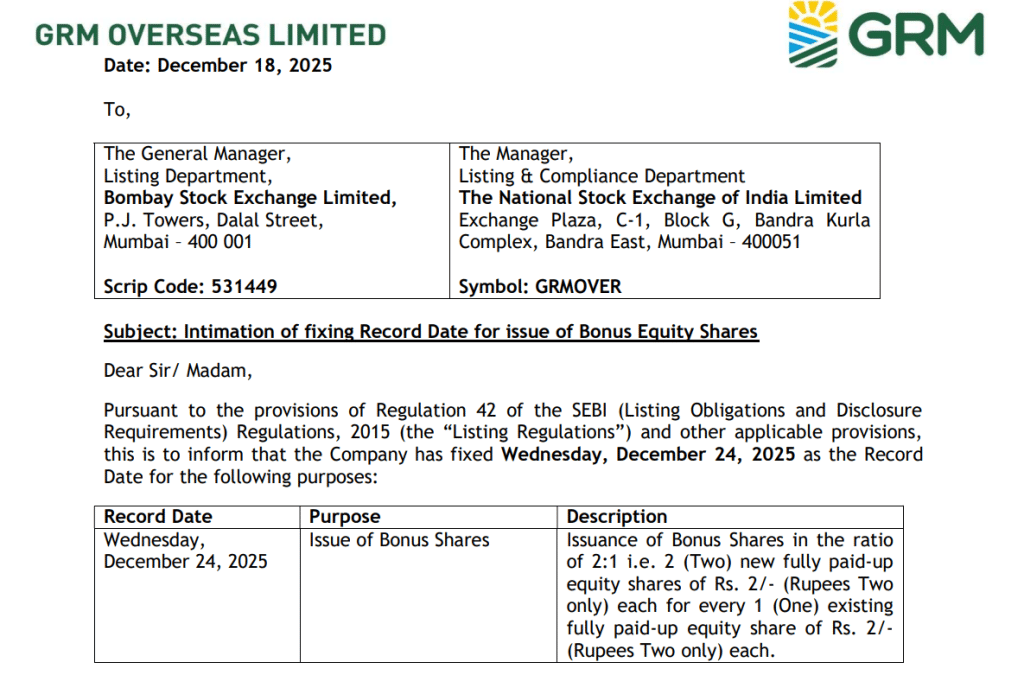GRM Overseas bonus shares: शेयर बाजार में मल्टीबैगर रिटर्न देने वाले स्मॉल कैप स्टॉक्स निवेशकों के बीच हमेशा चर्चा में रहते हैं. ऐसा ही एक नाम है GRM Overseas, जिसने बीते 1 साल में करीब 140 फीसदी का शानदार रिटर्न देकर निवेशकों को चौंका दिया है. अब यह स्टॉक एक बार फिर सुर्खियों में है, क्योंकि कंपनी ने अपने 2:1 बोनस शेयर इश्यू के लिए रिकॉर्ड डेट का ऐलान कर दिया है. इस घोषणा के बाद बाजार में GRM Overseas के शेयर पर निवेशकों की खास नजर बनी हुई है. कंपनी ने जानकारी दी है कि बुधवार, 24 दिसंबर 2025 को रिकॉर्ड डेट तय की गई है.