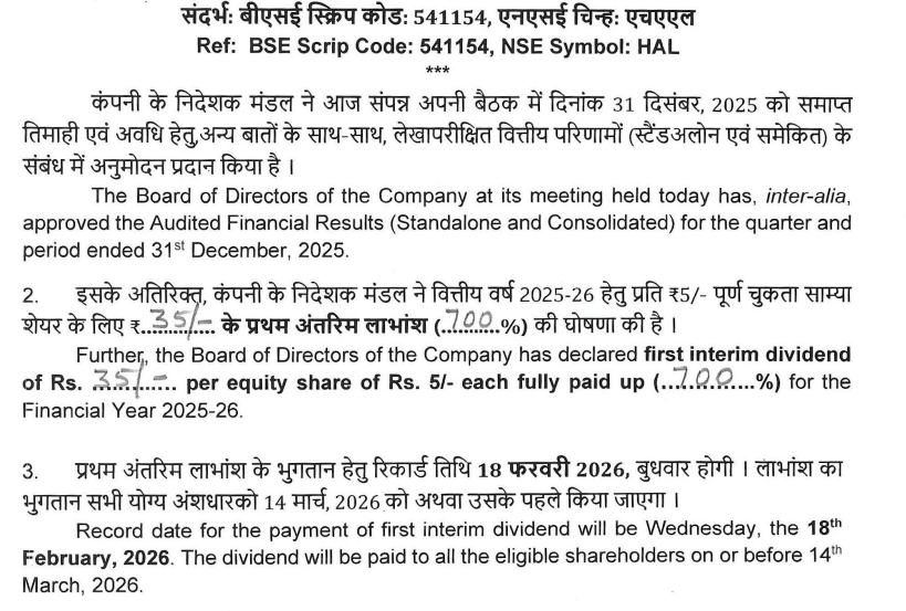 HAL Q3 Result and Dividend Record Date: हिंदुस्तान एयरोनॉटिक्स लिमिटेड (HAL) ने वित्त वर्ष 2025-26 के लिए अपना पहला अंतरिम डिविडेंड घोषित कर दिया है. कंपनी ने शेयर बाजार को दी गई जानकारी में बताया कि बोर्ड ने 5 रुपये फेस वैल्यू वाले प्रत्येक इक्विटी शेयर पर 35 रुपये का अंतरिम डिविडेंड मंजूर किया है. यह फेस वैल्यू का 700 फीसदी बैठता है, यानी निवेशकों को अच्छी नकद वापसी मिलने वाली है. कंपनी ने इस डिविडेंड के लिए बुधवार, 18 फरवरी के दिन को रिकॉर्ड डेट के तौर पर तय किया है.