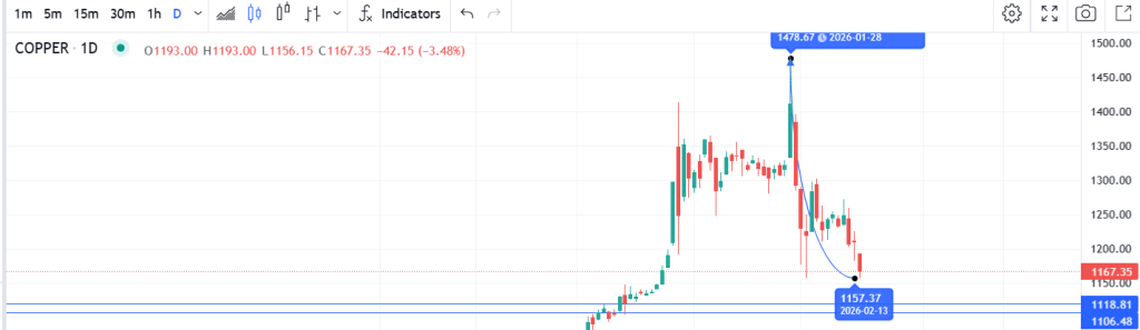 मंगलवार को मल्टी कमोडिटी एक्सचेंज यानी MCX पर फरवरी कॉन्ट्रैक्ट 1.5 प्रतिशत गिरकर इंट्राडे में 1166 रुपये तक आ गया. मुनाफावसूली तेज होने से गिरावट और बढ़ी. फरवरी कॉपर फ्यूचर्स ने इससे पहले MCX पर 1480.30 रुपये का लाइफटाइम हाई बनाया था.