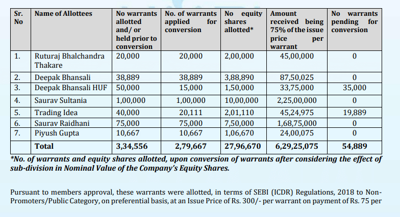 यह शेयर अलॉटमेंट प्रेफरेंशियल बेसिस पर किया गया है और इसमें प्रमोटर ग्रुप शामिल नहीं है. यह अलॉटमेंट SEBI के ICDR रेगुलेशंस, 2018 के नियमों के तहत नॉन-प्रमोटर और पब्लिक कैटेगरी के सात निवेशकों को किया गया है. इन निवेशकों में रुतुराज भालचंद्र ठाकरे, दीपक भंसाली, दीपक भंसाली (HUF), सौरव सुल्तानिया, ट्रेडिंग आइडिया, सौरव रैधानी, पियूष गुप्ता शामिल हैं.
