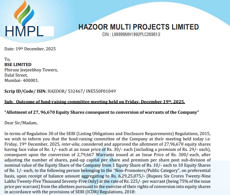 HMPL Warrants Conversion Stock: BSE में लिस्टेड रियल एस्टेट और इंफ्रास्ट्रक्चर डेवलपमेंट कंपनी Hazoor Multi Projects Limited (HMPL) ने फंड जुटाने से जुड़ा एक बड़ा अपडेट दिया है. कंपनी ने वारंट्स के कन्वर्जन के बदले इक्विटी शेयर अलॉट करने की घोषणा की है, जिसके जरिए उसने करीब 6.29 करोड़ रुपये जुटाए हैं. इस घोषणा के बाद 50 रुपये से नीचे ट्रेड करने वाला यह स्मॉल-कैप शेयर सोमवार, 22 दिसंबर को बाजार खुलते ही निवेशकों की नजर में रहने वाला है.