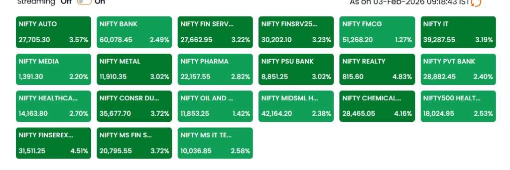 शुरुआती कारोबार में तेजी सभी सेक्टरों में फैलती दिखी. निफ्टी के सभी प्रमुख सेक्टोरल इंडेक्स हरे निशान में कारोबार कर रहे थे. निफ्टी रियल्टी इंडेक्स 4 फीसदी से अधिक की बढ़त के साथ सबसे आगे रहा. इसके अलावा ऑटो, इंफ्रास्ट्रक्चर, कंज्यूमर ड्यूरेबल्स, आईटी और मेटल शेयरों में भी मज़बूत खरीदारी देखने को मिली. बैंकिंग शेयरों में भी जोश बना रहा, जहां निफ्टी प्राइवेट बैंक करीब 3 फीसदी और निफ्टी बैंक 2.5 फीसदी से ज्यादा चढ़ा, जिससे बाज़ार में रिस्क-ऑन मूड साफ झलका.