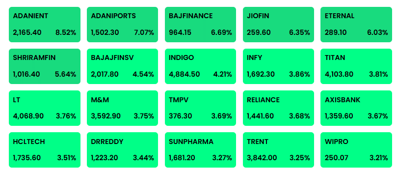 निफ्टी पर बढ़त हासिल करने वाले शेयरों में फाइनेंशियल और अडानी समूह के स्टॉक्स छाए रहे. अडानी एंटरप्राइजेज करीब 9 फीसदी और अडानी पोर्ट्स 7 फीसदी से ज्यादा की तेज़ी के साथ टॉप गेनर्स में शामिल रहे. बजाज फाइनेंस, जियो फाइनेंशियल सर्विसेज और श्रीराम फाइनेंस में भी ज़ोरदार उछाल देखा गया. वहीं आईटी और फार्मा सेक्टर से इंफोसिस और डॉ. रेड्डीज लैबोरेटरीज ने भी तेजी में योगदान दिया.