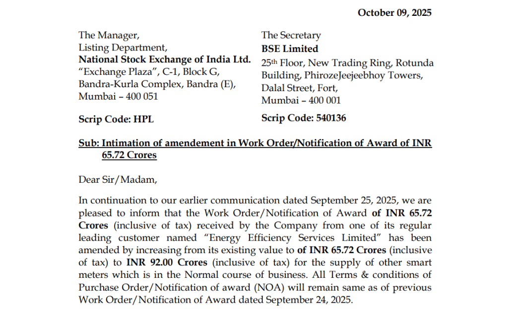 92 करोड़ रुपये का यह ऑर्डर कंपनी की रेवेन्यू पाइपलाइन को मजबूती प्रदान करेगा. स्मार्ट मीटर भारत की Smart Grid योजना का एक अहम हिस्सा हैं और इस क्षेत्र में आने वाले वर्षों में लगातार ऐसे बड़े ऑर्डर मिलने की उम्मीद है. HPL का इस डोमेन में मजबूत पकड़ होना भविष्य के लिए एक सकारात्मक संकेत है.