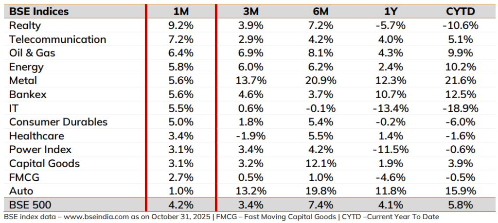 Oil & Gas इंडेक्स अक्टूबर में 6.4% चढ़ा और रिपोर्ट में इसे आगे भी पॉजिटिव बताया गया है. एनर्जी कंपनियों को रिफाइनिंग मार्जिन, गैस प्राइस स्टेबिलिटी और वैल्यू-एडेड प्रोडक्ट्स की वजह से लाभ मिल रहा है. ICICI Prudential का अनुमान है कि सरकारी रिफाइनर्स और गैस मार्केटिंग कंपनियों के मार्जिन में सुधार जारी रहेगा, जिससे Q3 FY26 तक बेहतर अर्निंग ट्रैक्शन दिख सकता है.