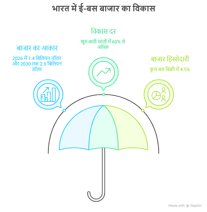 भारत का इलेक्ट्रिक बस बाजार अभी छोटा है, लेकिन तेजी से बढ़ रहा है. 2026 में इसका आकार करीब 1.4 बिलियन डॉलर है और 2030 तक यह 2.5 बिलियन डॉलर के आसपास पहुंच सकता है. शुरुआती सालों में इसमें 60 प्रतिशत से ज्यादा की ग्रोथ देखी गई है. अभी कुल बस बिक्री में ई-बस की हिस्सेदारी करीब 4.5 प्रतिशत है.