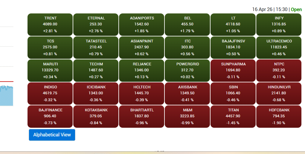 15 अप्रैल को बाजार में शानदार तेजी रही थी. सभी सेक्टरों में चौतरफा खरीदारी देखने को मिली. इस दौरान बाजार में जोरदार उछाल देखने को मिला, जहां सेंसेक्स 1263 अंक की बढ़त के साथ 78,111 के स्तर पर बंद हुआ, वहीं निफ्टी 388 अंक चढ़कर बंद हुआ. निफ्टी में आई इस तेजी का असर दिग्गज शेयरों पर भी साफ दिखा. प्रमुख बढ़त वाले शेयरों में InterGlobe Aviation, Max Healthcare, Power Grid Corporation of India, Larsen & Toubro और Eternal Limited शामिल रहे. वहीं गिरावट वाले शेयरों में Dr. Reddy’s Laboratories, Bharti Airtel और ICICI Bank पर दबाव देखने को मिला.