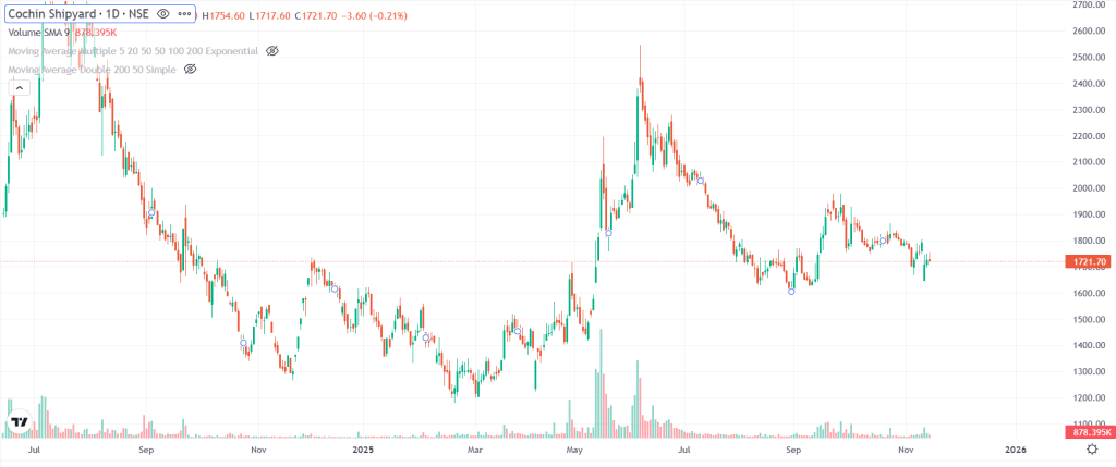 - देश में शिप रिपेयरिंग और ग्रीनफील्ड पोर्ट्स के बढ़ते काम से Cochin Shipyard को मजबूत ग्रोथ सपोर्ट मिलने की संभावना है.