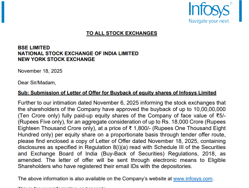 Infosys Ltd ने 18,000 करोड़ रुपये के शेयर बायबैक की घोषणा कर दी है. कंपनी हर शेयर को 1,800 रुपये में खरीदेगी, जिसमें छोटे और सामान्य शेयरधारकों के लिए खास नियम लागू हैं. यह कदम कंपनी की नकदी और कैपिटल स्ट्रक्चर को मजबूत बनाने के उद्देश्य से है. पिछली बार कंपनी ने 2022 में 9,300 करोड़ रुपये का बायबैक किया था.