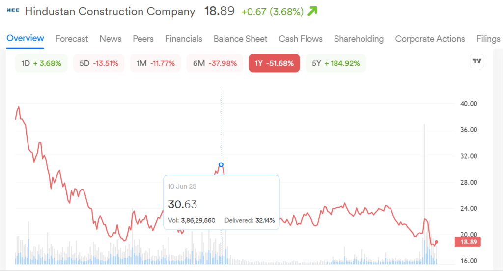 Hindustan Construction Company (HCC) आज खबरों में है. कंपनी ने अपनी देनदारियों को कम करने की रणनीति में एक बड़ा कदम उठाया है. अब कंपनी ने Prolific Resolution Pvt Ltd (PRPL) से जुड़ी अपनी कॉरपोरेट गारंटी एक्सपोजर में 3,364 करोड़ रुपये की भारी कमी की है. इससे कंपनी का बैलेंस शीट मजबूत होगा, जिसका फायदा आने वाले समय में कंपनी और निवेशकों को होगा. इस शेयर ने निवेशकों को मल्टीबैगर रिटर्न दिया है. हालांकि हाल के समय में इसमें काफी गिरावट देखने को मिली है. 10 जून को यही शेयर 31 रुपये के आस-पास कामकाज कर रहा था, जो अब गिरकर 18 रुपये के करीब आ चुका है.