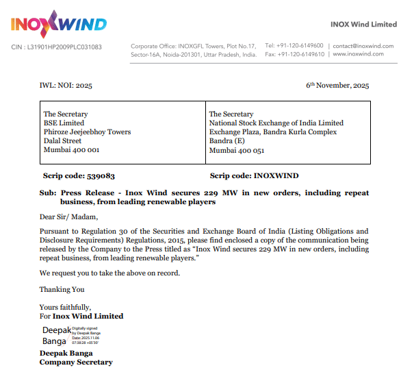 आइनॉक्स विंड लिमिटेड ने अपने ऑर्डर बुक को मजबूत करते हुए कुल 229 मेगावाट के नए ऑर्डर हासिल किए हैं. इनमें से एक प्रमुख भारतीय इंडिपेंडेंट पावर प्रोड्यूसर (IPP) ने कंपनी को उसकी एडवांस 3.3 मेगावाट विंड टर्बाइन यूनिट्स के लिए 160 मेगावाट तक का ऑर्डर दिया है. इसके अलावा कंपनी को 69 मेगावाट का रिपीट ऑर्डर भी मिला है जो एक प्रमुख अंतरराष्ट्रीय क्लीन एनर्जी ऑर्गेनाइजेशन से जुड़ी IPP कंपनी ने दिया है. यह वही ग्राहक है जिसने मार्च 2025 में 153 मेगावाट का ऑर्डर दिया था. इन ऑर्डरों में लिमिटेड स्कोप EPC (इंजीनियरिंग, प्रोक्योरमेंट और कंस्ट्रक्शन) और मल्टी-ईयर ऑपरेशन एंड मेंटेनेंस (O&M) सर्विस शामिल हैं.