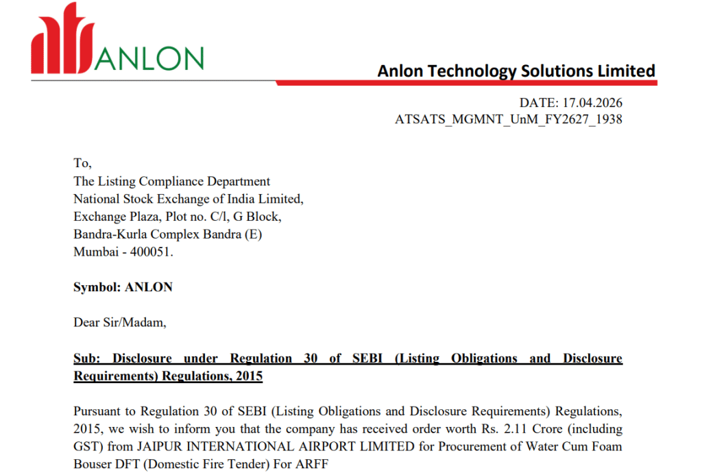 Anlon Technology Solutions: भारत के तेजी से बढ़ते एविएशन सेक्टर में एक और अहम कारोबारी अपडेट सामने आया है. Anlon Technology Solutions Limited को जयपुर इंटरनेशनल एयरपोर्ट लिमिटेड से 2.11 करोड़ रुपये का नया ऑर्डर मिला है. इस डील के बाद कंपनी ने एयरपोर्ट सेफ्टी और इंजीनियरिंग सॉल्यूशंस सेक्टर में अपनी मौजूदगी और मजबूत कर ली है. यह ऑर्डर कंपनी के लिए सिर्फ एक नया कॉन्ट्रैक्ट नहीं, बल्कि एविएशन इंफ्रास्ट्रक्चर क्षेत्र में बढ़ते भरोसे का संकेत है.