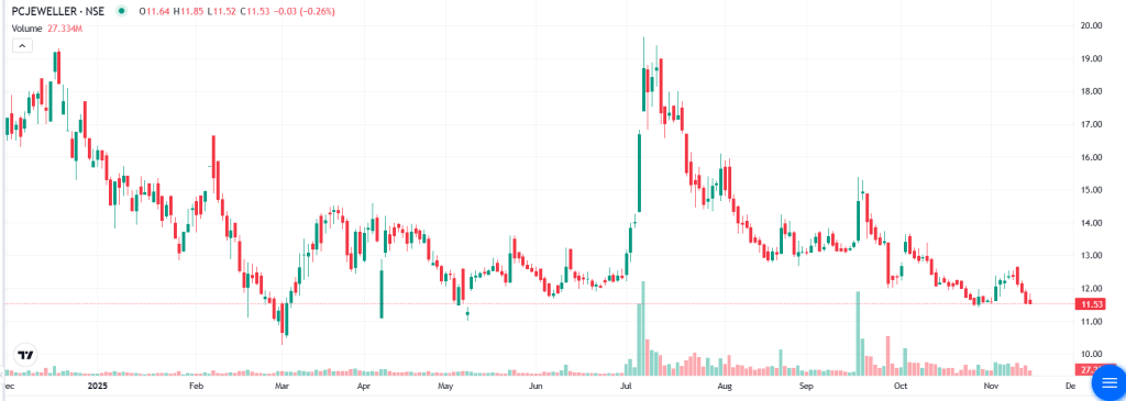 चर्चित ज्वेलरी कंपनी PC Jeweller Ltd एक बार फिर खबरों में है. कंपनी ने अपने पेनी स्टॉक में एक अहम कॉर्पोरेट ऐक्शन किया है, जिसके बाद इसके शेयर्स की संख्या और पेड-अप कैपिटल दोनों में इजाफा हुआ है. दिलचस्प बात यह है कि कंपनी पिछले कुछ समय से लगातार कर्ज कम करने, कैश फ्लो सुधारने और मजबूत रिजल्ट पेश करने पर फोकस कर रही है. यह शेयर अपने एक साल के हाई से 41 फीसदी नीचे कामकाज कर रहा है.