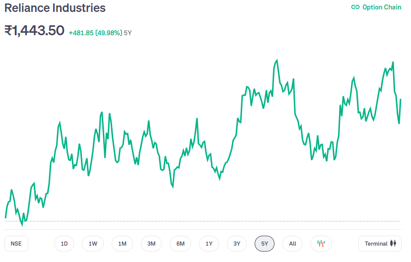 मंगलवार को दोपहर 12:48 बजे शेयर 53 अंक बढ़कर (3.82%) 1443.50 रुपये पर ट्रेड कर रहा था. कंपनी ने पिछले 5 साल में तकरीबन 49 फीसदी का रिटर्न दिया है.