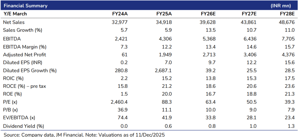 कंपनी के 1HFY26 के वित्तीय नतीजे बताते हैं कि ग्रॉस मार्जिन 43.8 प्रतिशत और EBITDA मार्जिन 12.4 प्रतिशत पर पहुंच गया है, जो FY23 के 37 प्रतिशत और 7.3 प्रतिशत के मुकाबले बेहद मजबूत सुधार है.